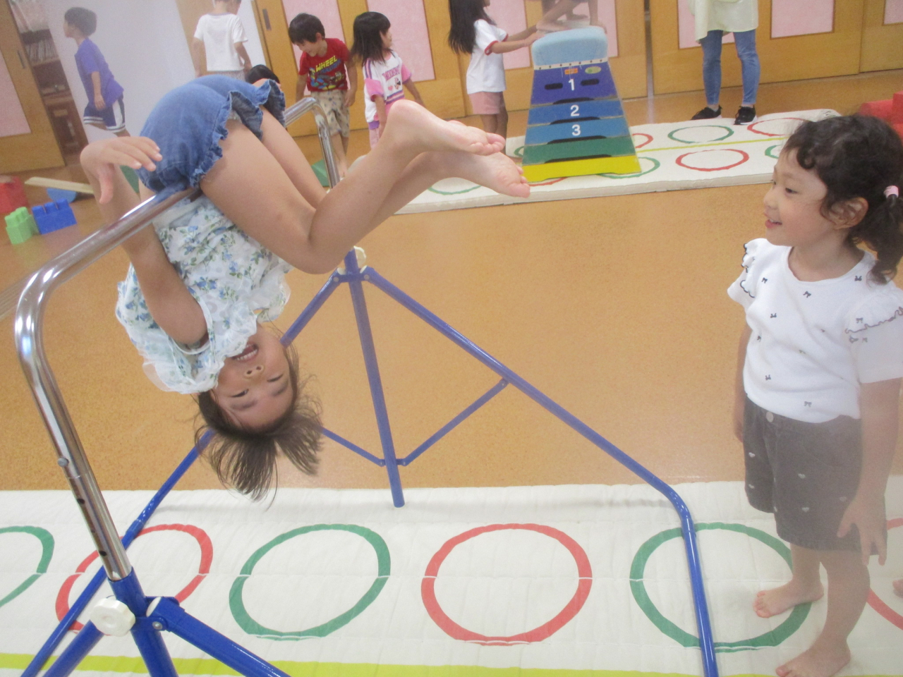 厳しい暑さで園庭に出られない日が続いていましたが、室内で鉄棒やとび箱を設置し