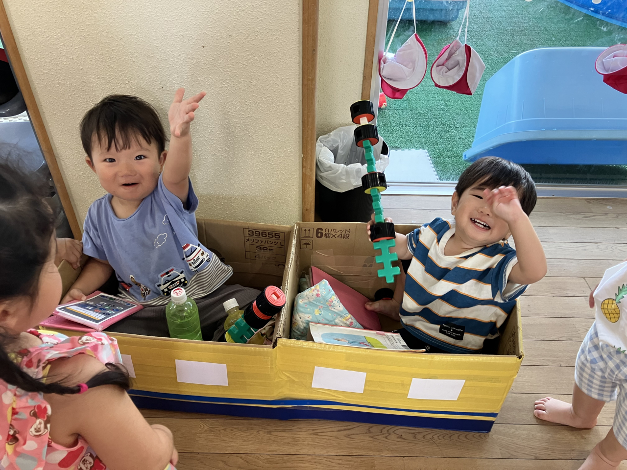 絵本「うみ100かいだてのいえ」から遊びが広がり、牛乳パック積み木で潜水艦を作ったり