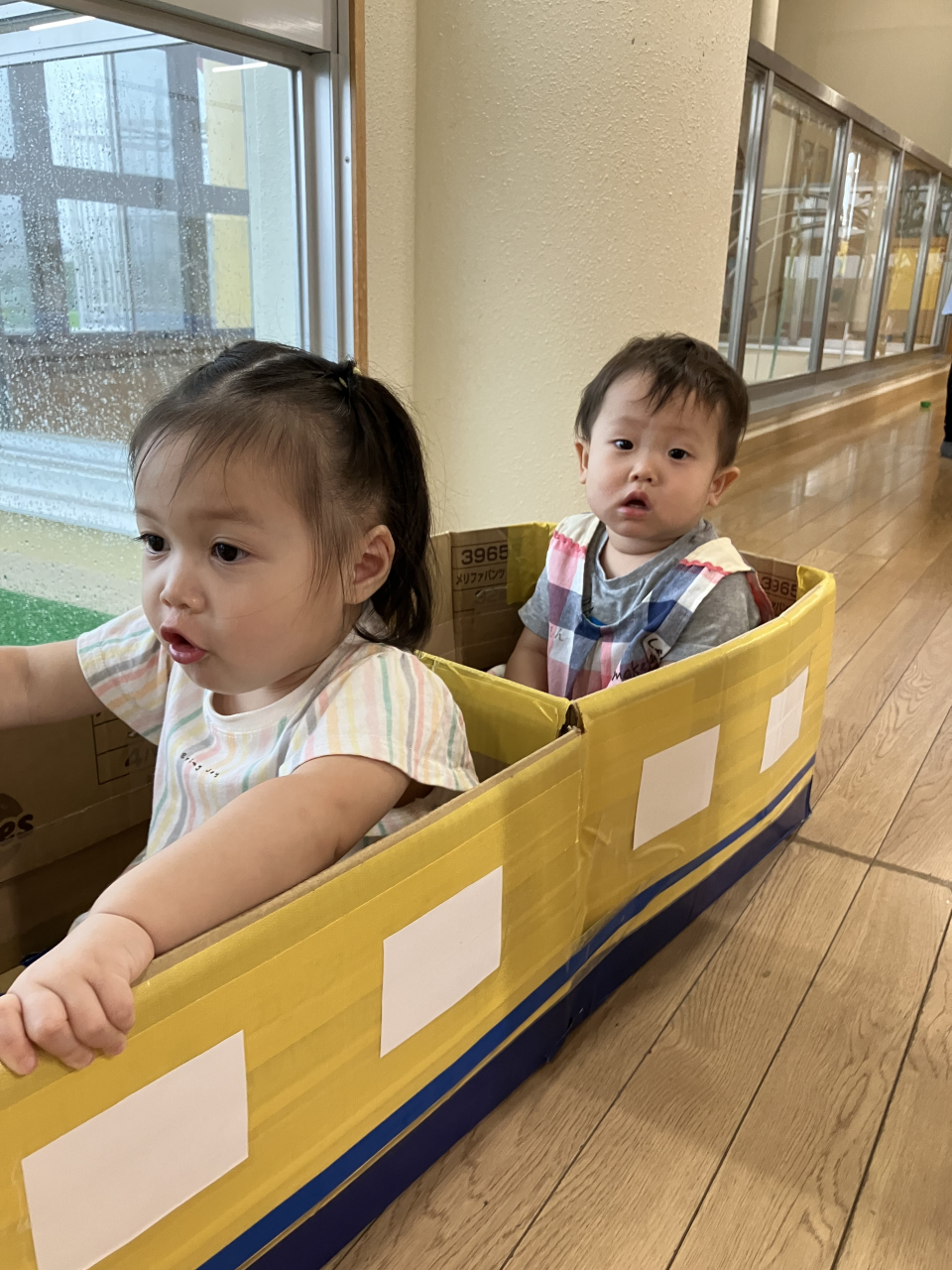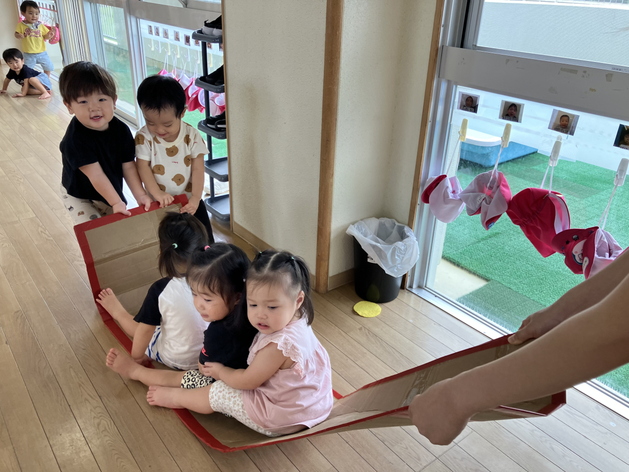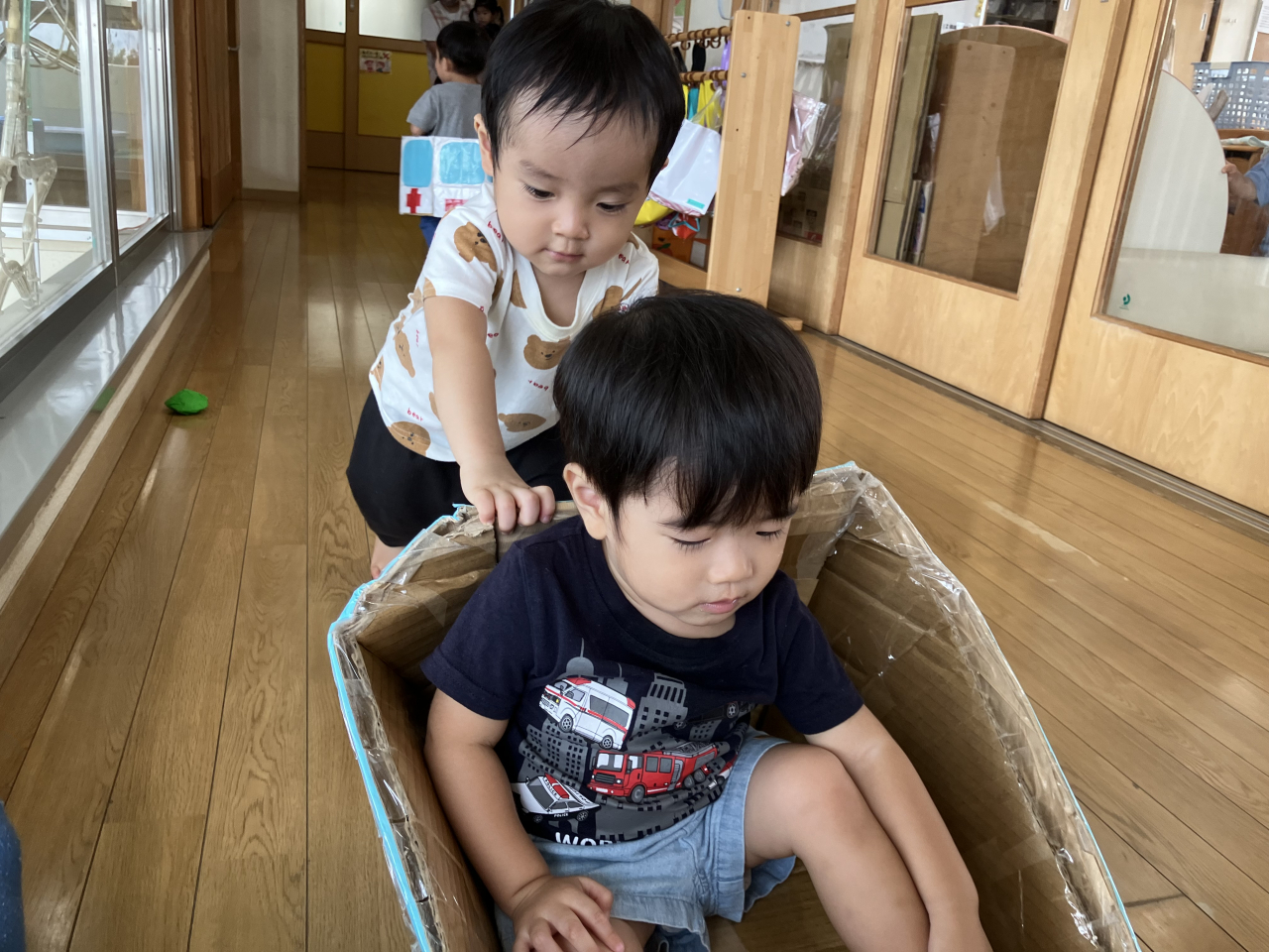 保育者に段ボールのカートを押して保育室や廊下を押してもらったことが楽しかったのか