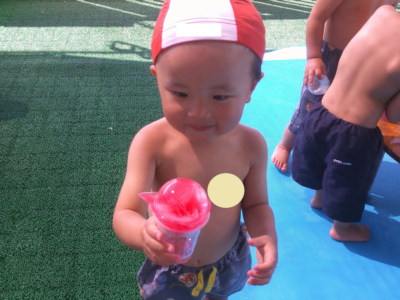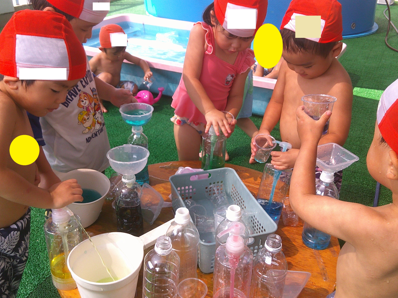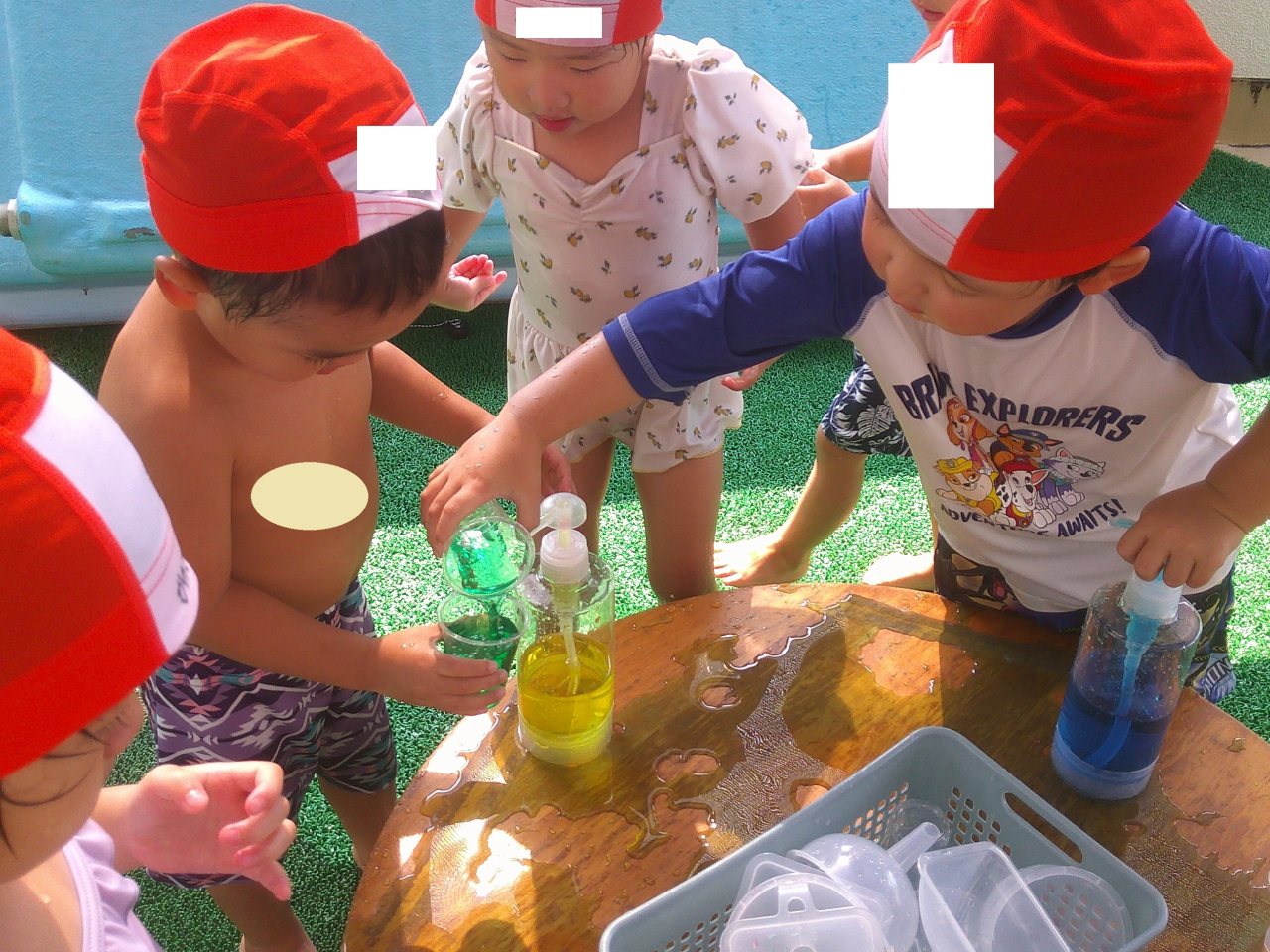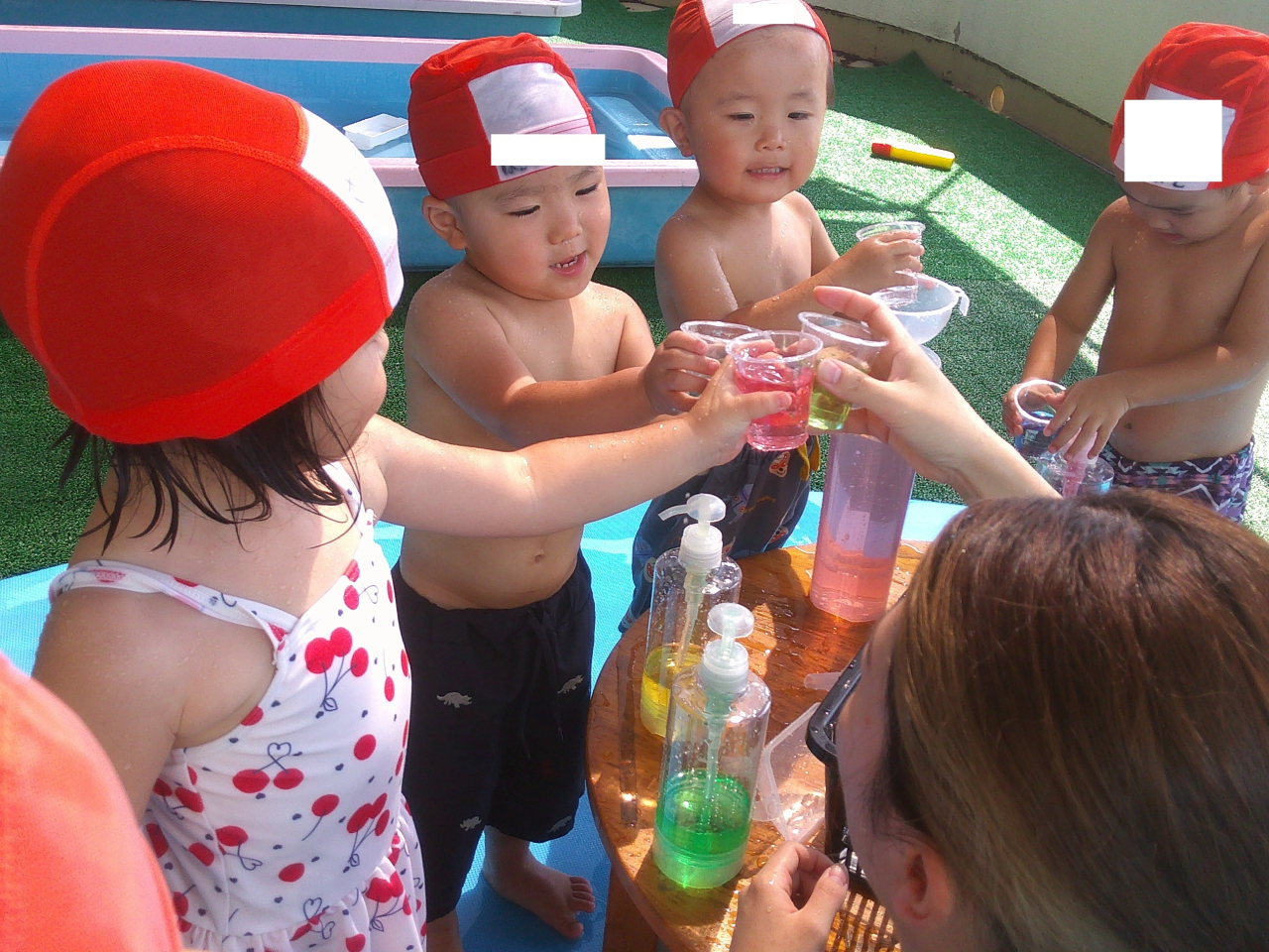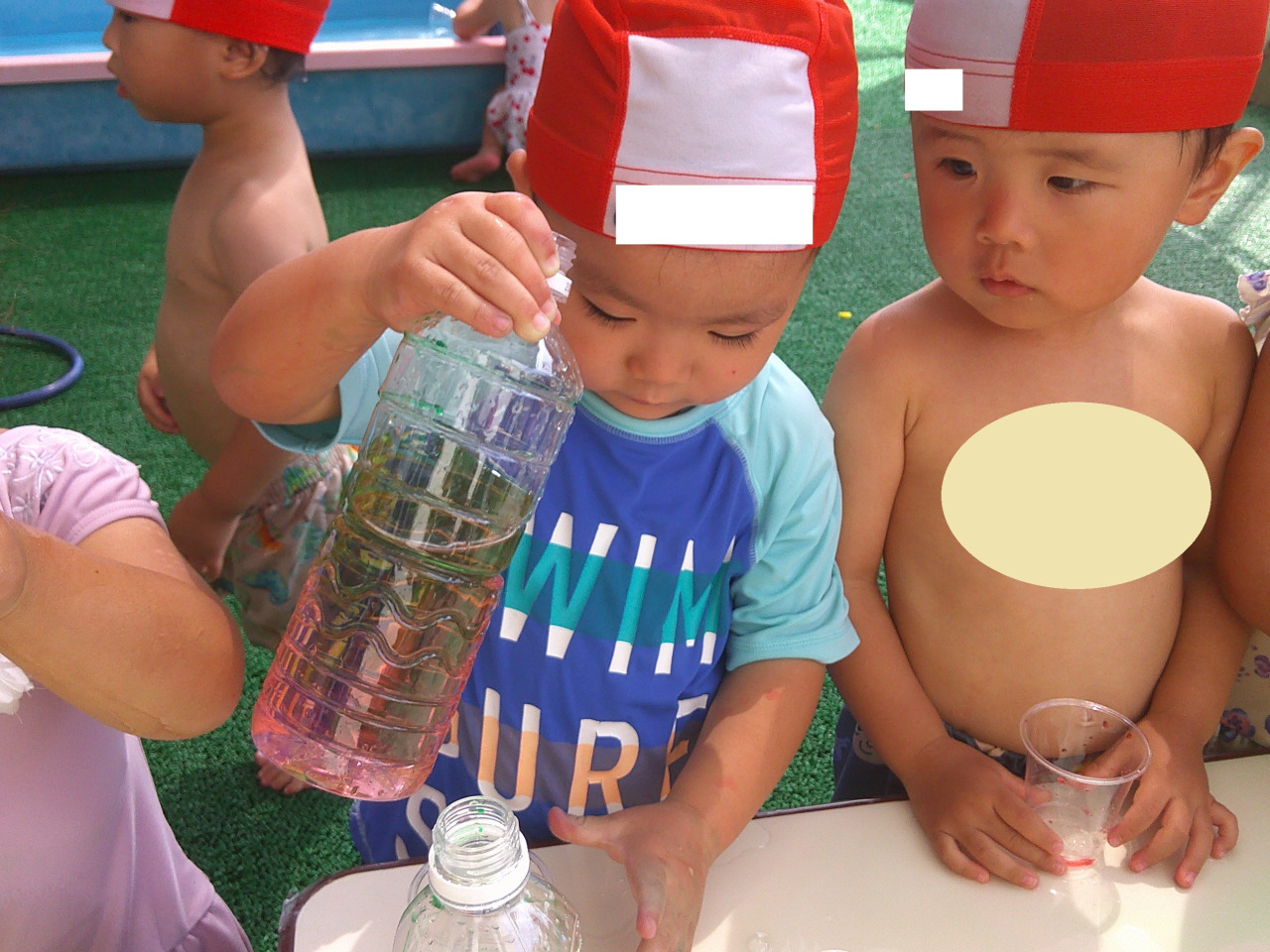 ジュース屋さんになりきって色水遊びを楽しむれもん組さん
