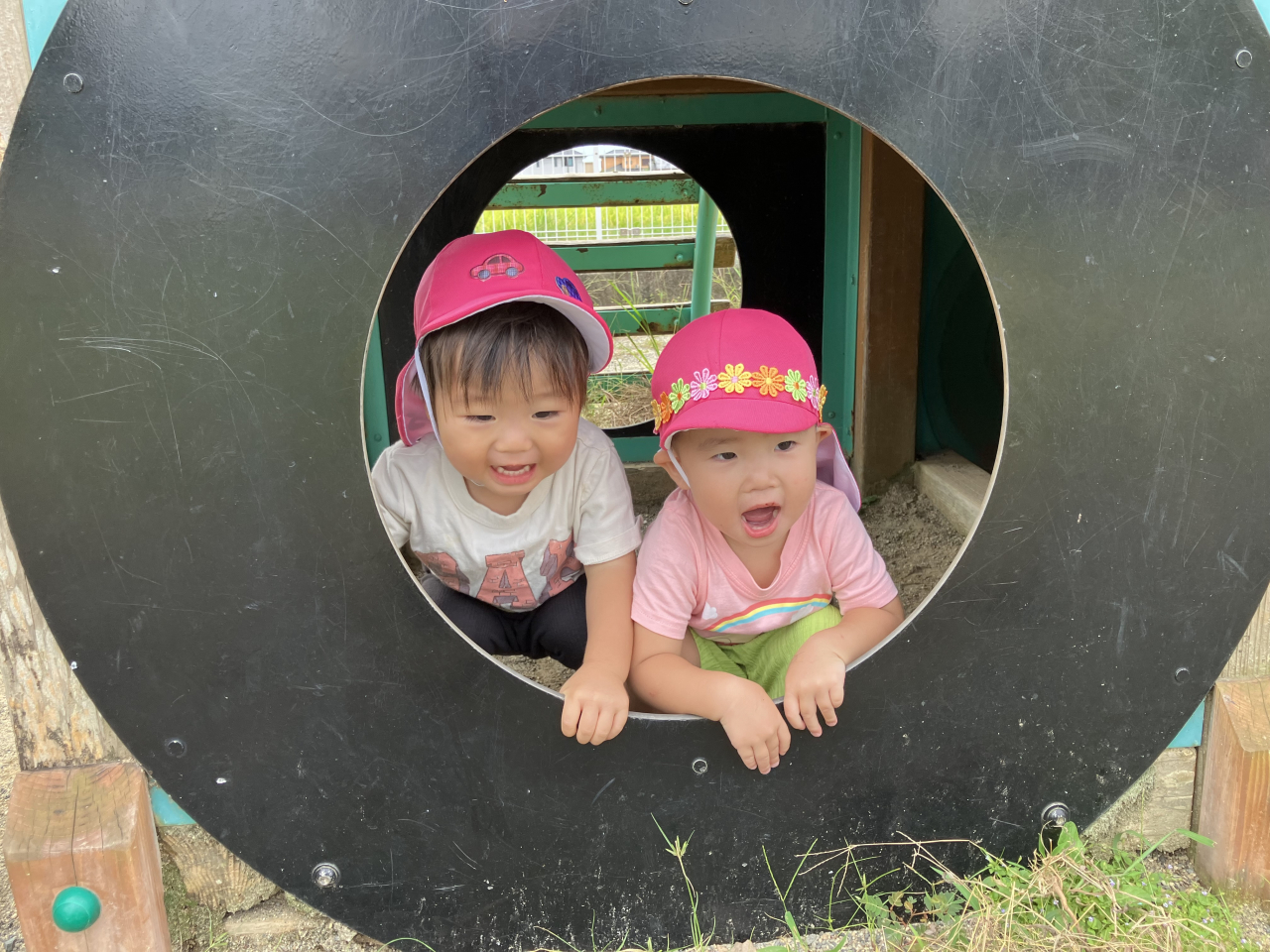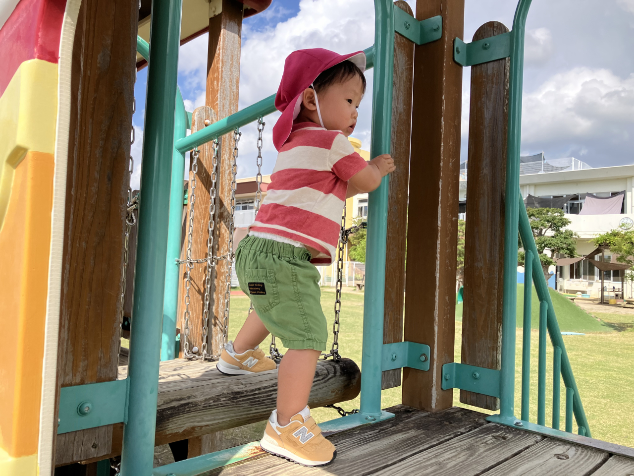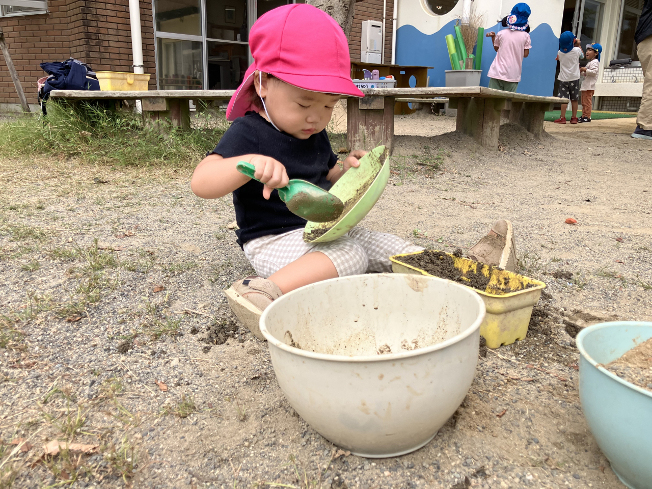 園庭では大型遊具や築山で身体を動かしたり大きい子の真似をしながらお砂遊びをしたり
