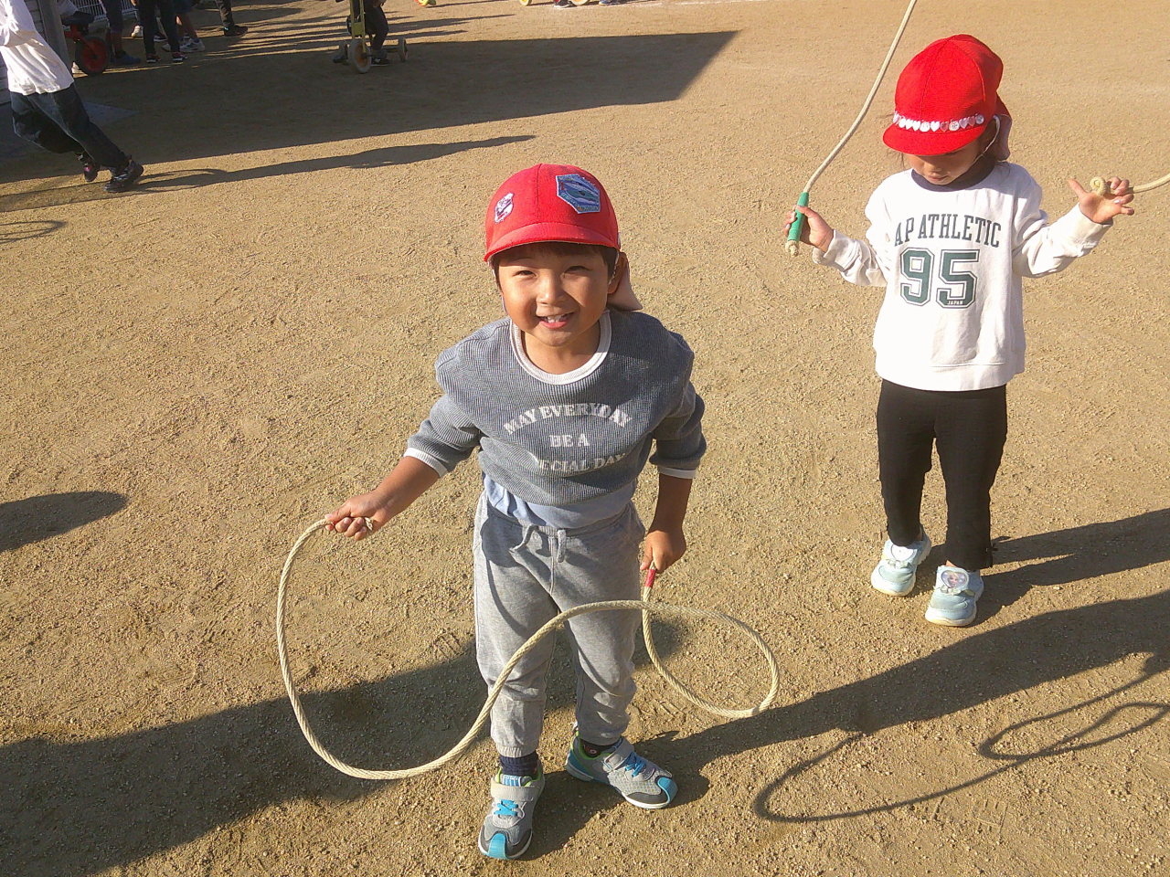 またここ最近は大きいクラスのお友だちに影響を受け、縄跳びに挑戦しています