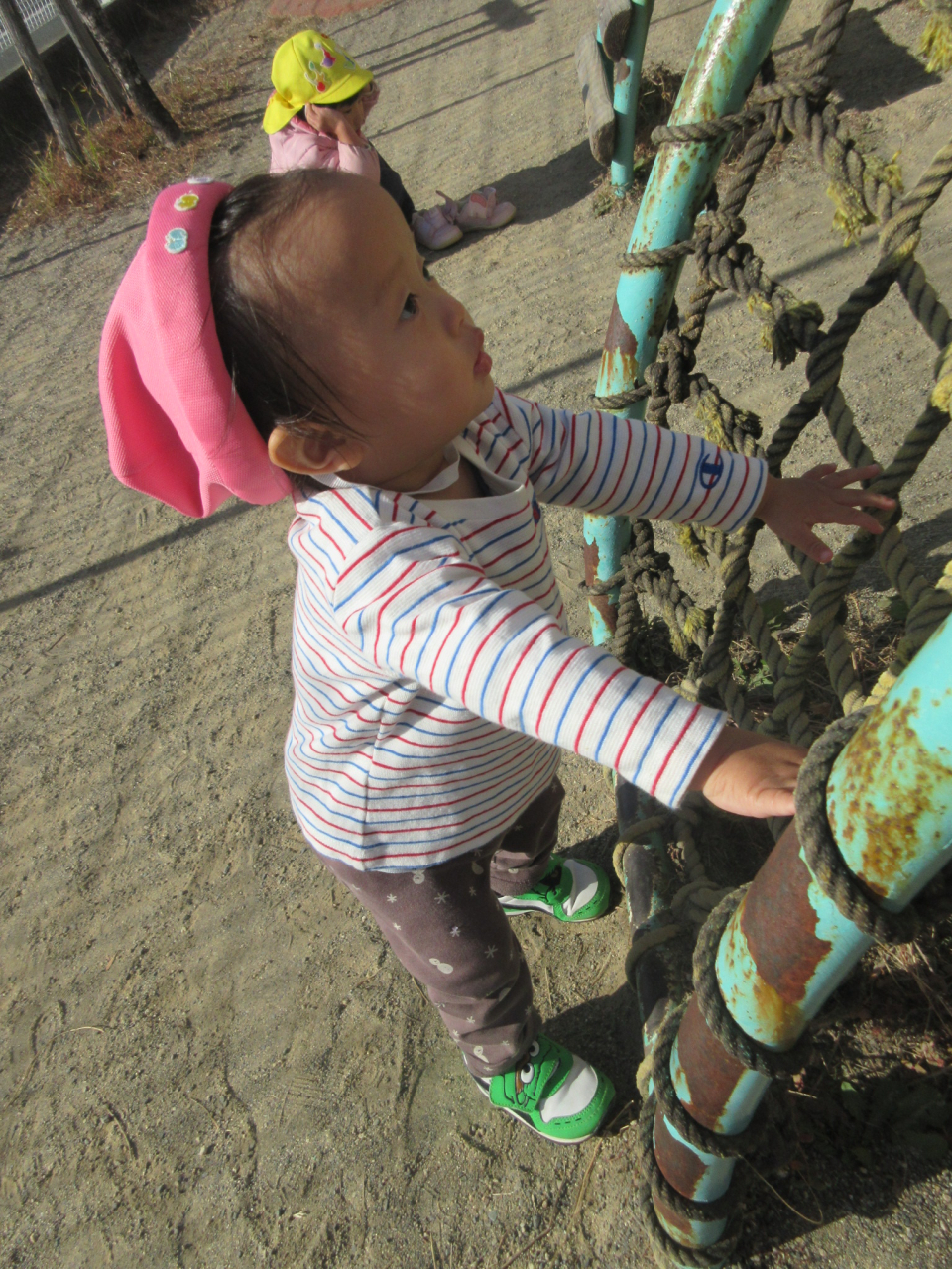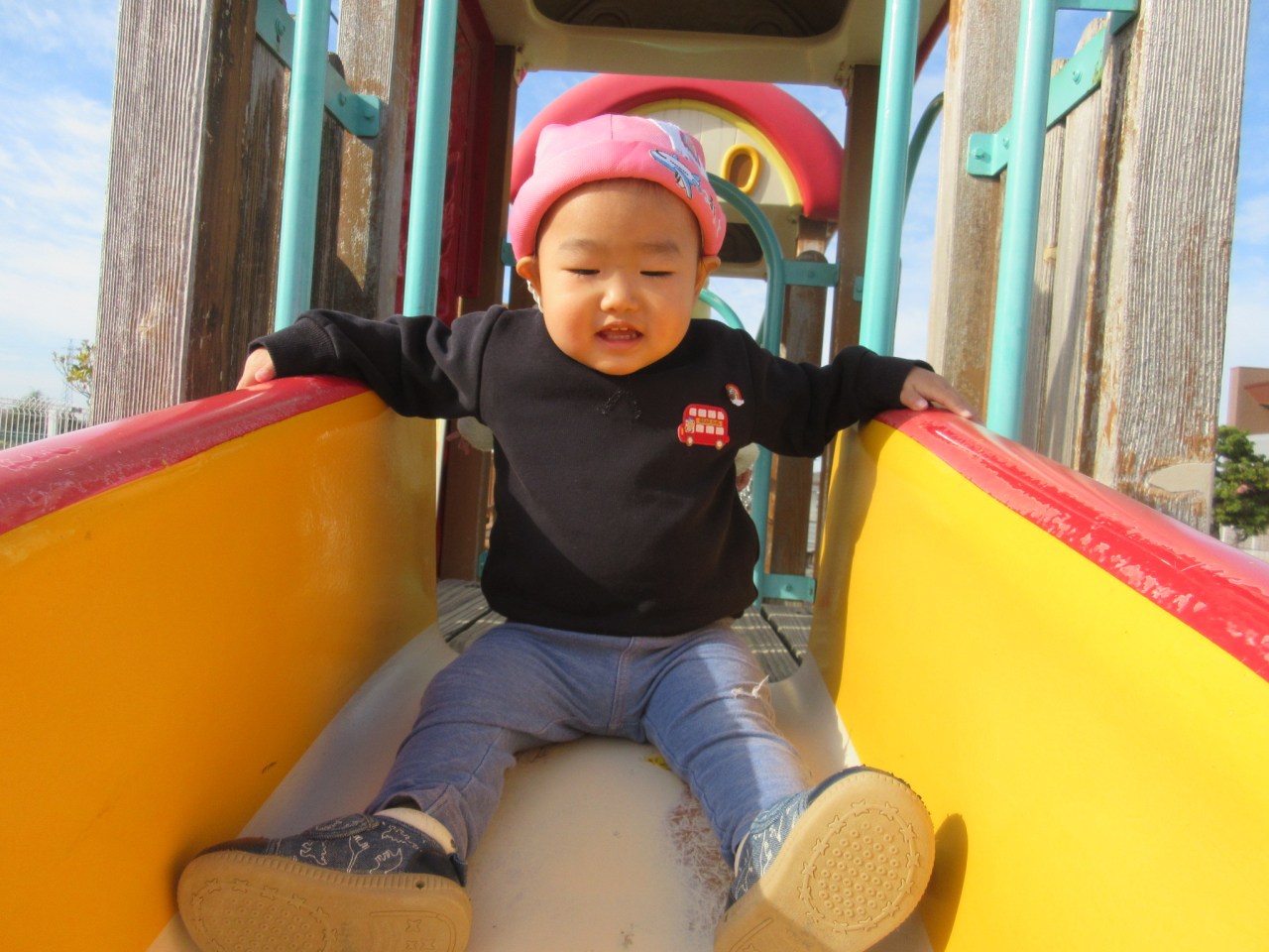 滑り台では登ったり滑ったりを繰り返したり、つき山にハイハイや立ったまま登ってみたりと