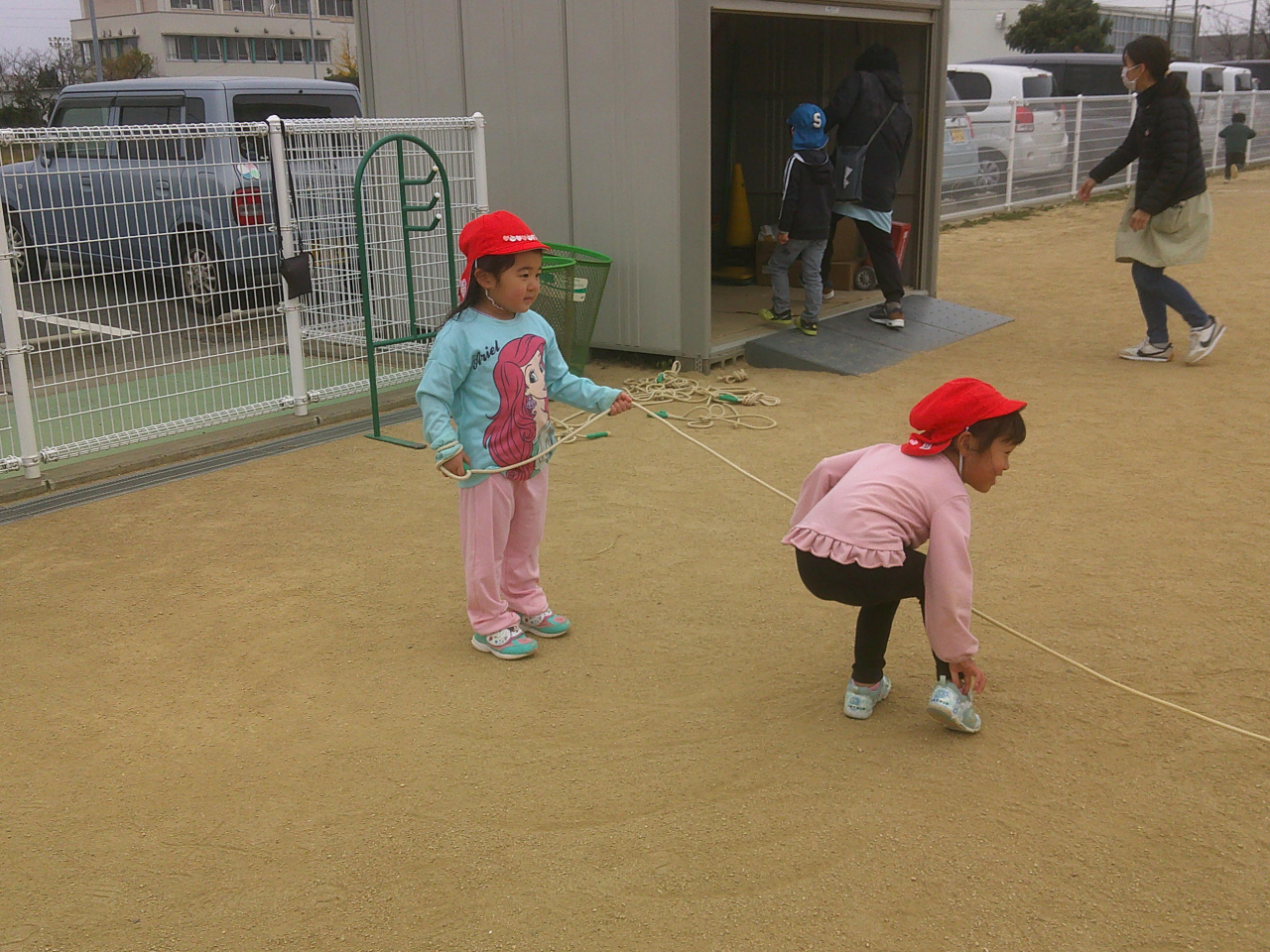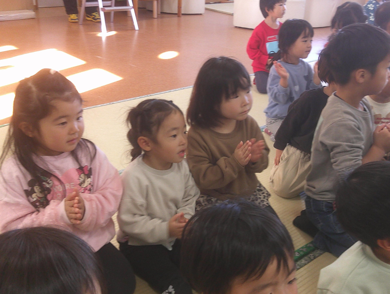 しろぐみさんやあおぐみさんの発表を見て、長縄や縄跳び、けん玉への意欲がより高まっています