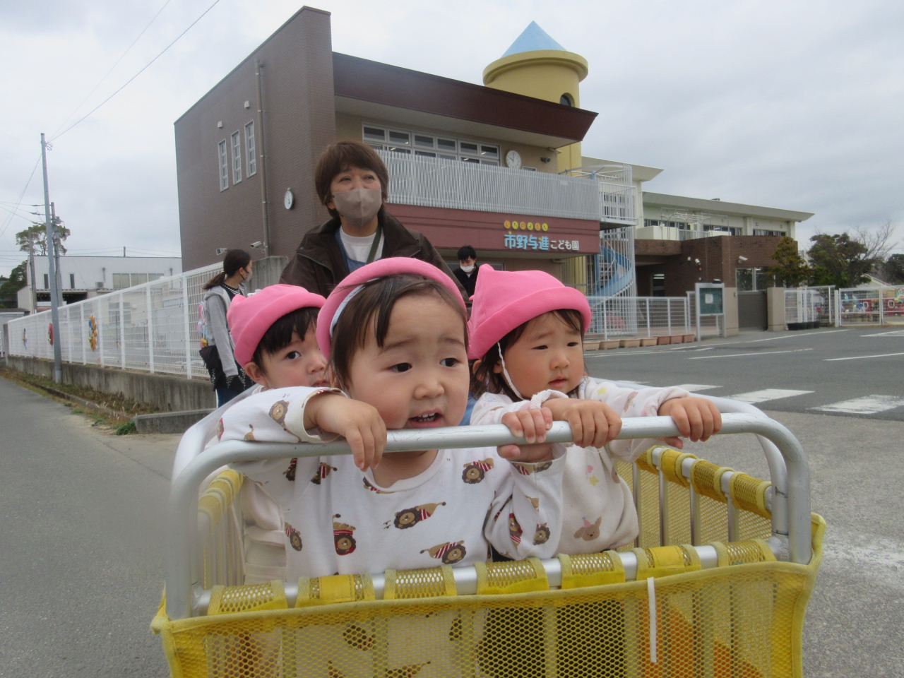 保育者と手をつないで歩いたり、お散歩カートに乗ったりして