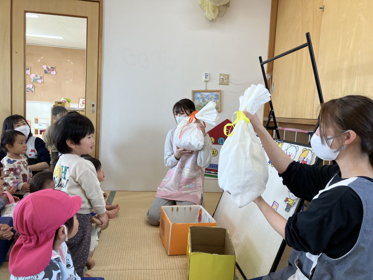 先生から帽子をもらうと嬉しそうな表情の子ども達