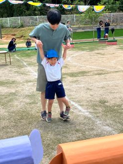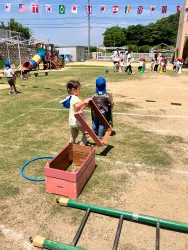 あお組さんは、難しいかなと足ぶみだけにしていましたが、なんだか真似っこして動けそうだぞとなり、本番4日前に動いちゃおう!!と動きだしました。足と手と声と…色々と一緒に動かすのって、人に教えられたものだとどうだっけ?となりますが、一緒に考えたり真似してみようとなると、主導権がこどもにあるので、自然とできてしまいます。参加してみようとする気持ちが育つように応援する事が私たちの仕事で、そのあとは、もう楽しむだけです。重たい―でも最後まで出来た。暑いーけど頑張った。とぼやきもしますけどね。