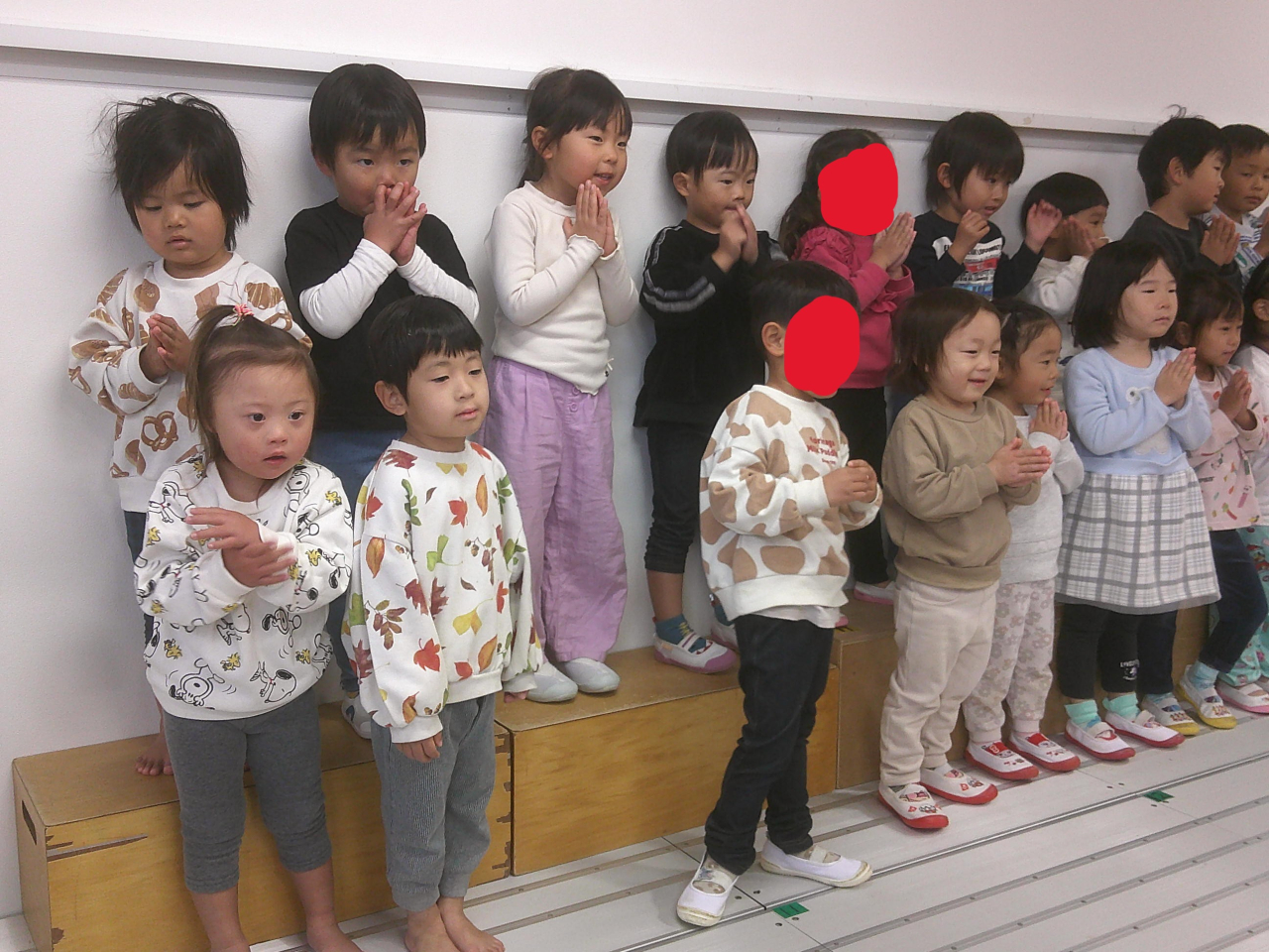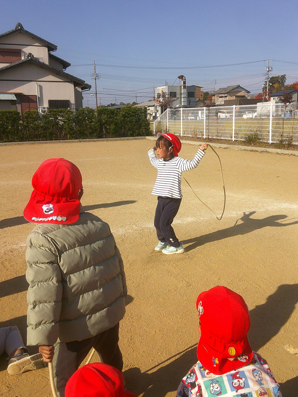 しろぐみさんやあおぐみさんの発表を見て、長縄や縄跳び、けん玉への意欲がより高まっています