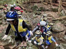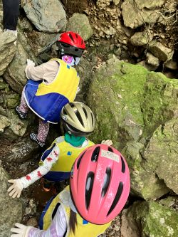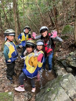 中でも、沢登りは、初めての挑戦です。ちょっと緊張気味。岩の上を、水の中を進みます。登った先にはあるものは!みんなそれぞれ見つけられたかな?