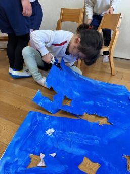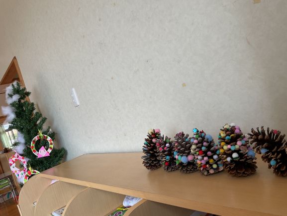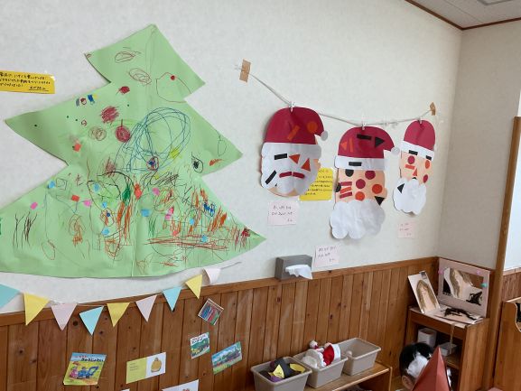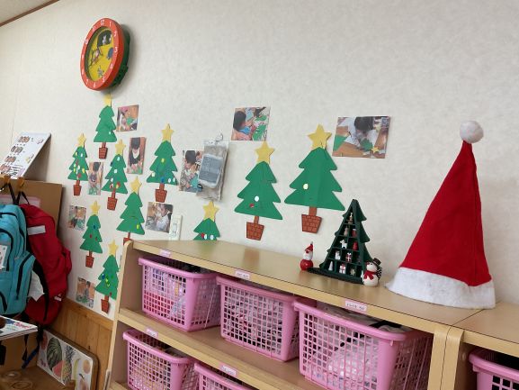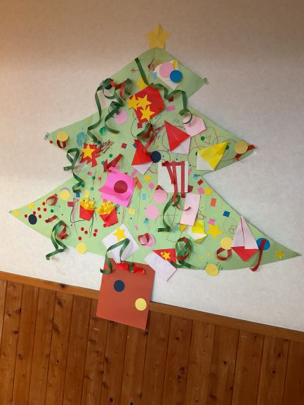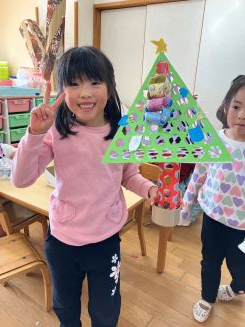 3、4,5、歳児クラスは、発表会で活躍した大道具が子どもたちのアイデアでクリスマスツリーに変身していきました。