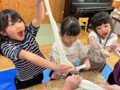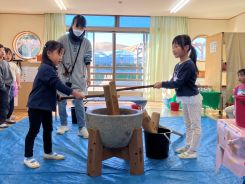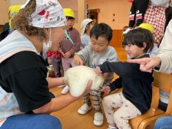 餅つきがしたい先生がいまして、子どもたちに話したら賛同を頂きまして、食べないけど、感触やにおいも楽しめるように鏡餅をつくる事にしました。久しぶりの餅つきだーと張り切る担当がインフルエンザになりましたが、先生方と子どもたちで力を合わせて餅つきを楽しんでくれました。