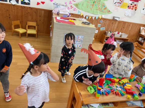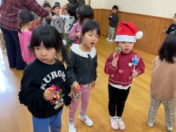 25日にサンタさんからプレゼントが届きました。乳児クラスはお菓子を、幼児クラスは、子ども達の遊びがますます盛り上がりそうな玩具です。お友だちや先生と一緒に楽しめますように。