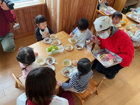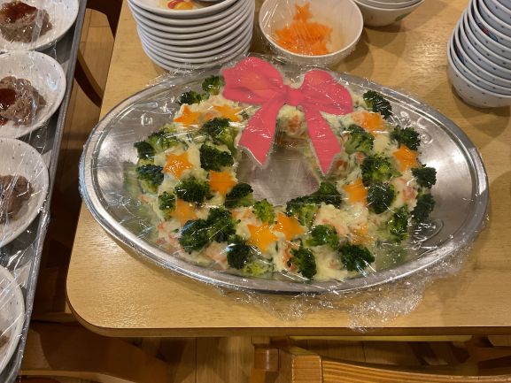 お昼には、給食室からプレゼント!ポテトサラダリースです。皆でシェアして頂きました。嬉しいね。
